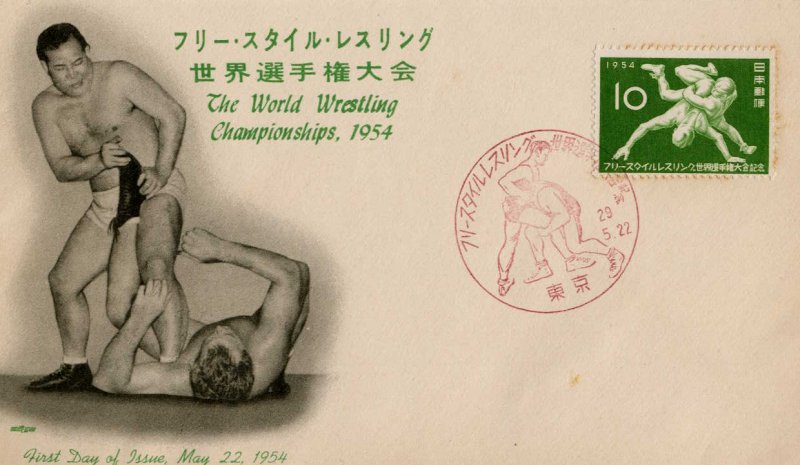 | 最近は、レスリング(アマレス)をプロレスと混同している人は少なくなってきたようですが、比較的最近まで、同じものと考えている人がかなりおりました。今、少年レスリングの歴史を色々と調べていますが、昭和40年代のことを見ますと、多くの場合、普及の障害になったのが、プロレスとの混同でした。 「あんな野蛮なものはうちの子にさせるわけにはいかない」 「いや、そういうんじゃないんですよ」 「駄目だ!あんな凶器を使うようなことはさせん!!」 こんな会話は当たり前の状況でした。いくら東京オリンピックで金メダルをとっても、世間の認識はそんなものでした。オリンピック後でもこの様な状況でしたから、日本レスリング創成期には、本当に様々な誤解があったようです。 前にご紹介した日本レスリングの創始者というべき庄司彦雄は、プロレスラーとの対戦経験もあり、大正〜昭和初期のアメリカ留学中には当時のプロレスに魅せられた人物でした。実際にプロレス界にもかなりコミットしており、当地の日系人社会では英雄的存在だったようです。そして、帰国後、八田会長等を誘って早稲田大レスリング部を創設するわけですが、彼のイメージは、明らかにプロレスのそれでした。部創設後に庄司が著した日本初のレスリング書籍は、プロレスの内容が満載です。彼の中では、基礎的技術はアマレス、さらに危険な技術も含めて相手を倒すのがプロレス、という認識のようです。いまでいう、総合格闘技のようなものですね。つまり、完全なプロ−アマの関係で見ていたのです。こんなレスリング観の違いもあり、1年も経たずに早大レスリング部のグループから抜けてしまいました。 次にご紹介したいのは、昭和29年、日本で世界選手権が開催された時のことです。この時、大会記念切手が発売されました。日本が連合軍の占領から解放され、ようやく国際社会に出ていこうとする、まさにそんな復興期での開催だっただけに、この大会は、世間的にも注目されていたのだと思います。さて、その発売時、切手と一緒に一枚の封筒がセットになって販売されていました。その封筒が問題なのです。とにかく見てください。 |